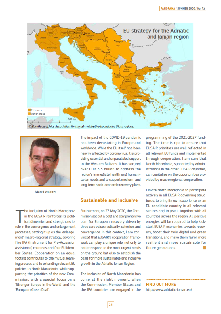 The article on page 24 shares welcoming words of the Ambassador of the Mission of North Macedonia to the EU, Ms Agneza Rusi Popovska, and of the Director-General of DG REGIO, Mr Marc Lemaître, while reflecting on the opportunities and current challenges that arise for the Adriatic and Ionian Region.